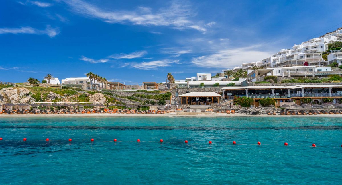 Santa Marina offers the best beach experience of any resort in Mykonos.Nestled in a quiet cove this curve of golden sand slopes gradually into crystal-clear, shallow waters.
